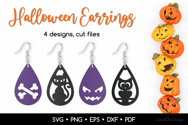 Teardrop Halloween Earrings or Pendant Template cut files. The set consists of 4 designs with bones, cat, face and owl.