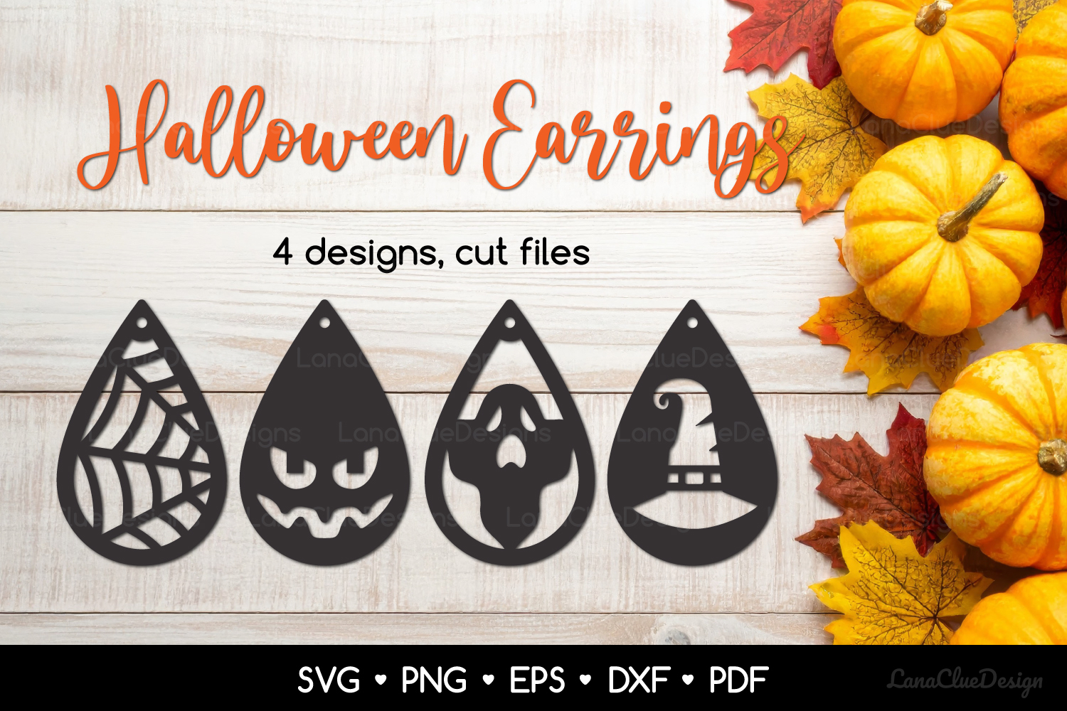 Teardrop Halloween Earrings or Pendant Template cut files. The set consists of 4 designs with spiderweb, scary face, ghost and witch hat.