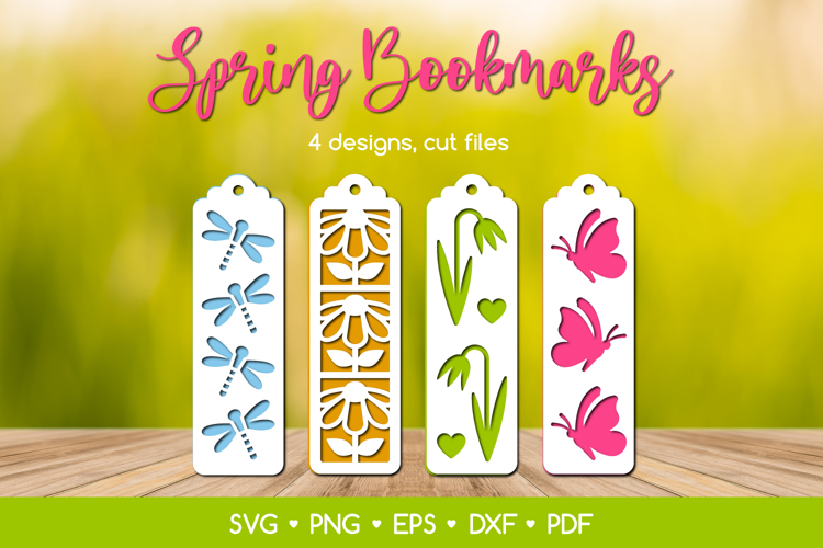 Two Layered Spring Bookmark Papercut Templates. The set consists of 4 designs with Dragonfly, Flowers, Butterfly + second layer.