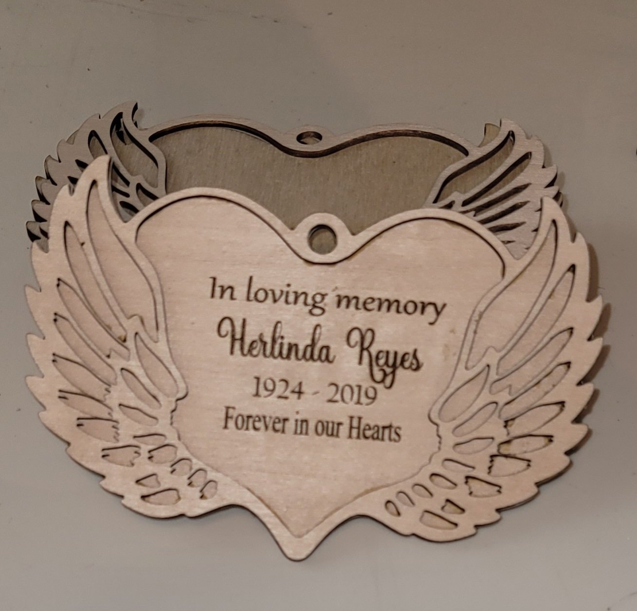 4 designs of memorial hearts with angel wings are made for CNC laser cutter, CriCut machines, Glowforge and any other compatible cutting machine. You can use it as two layered or one layered design for memorial christmas ornament or pendant. You can engrave your text or image on the bottom layer. There is two options design -- with and without holes.