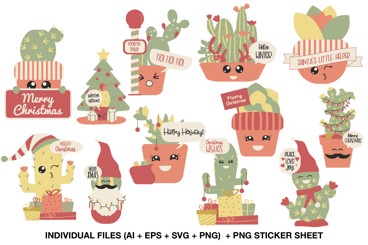 Each illustration features a cute cactus or succulent decorated for the holidays — wearing Santa hats, cozy scarves, fairy lights, and holding gifts.