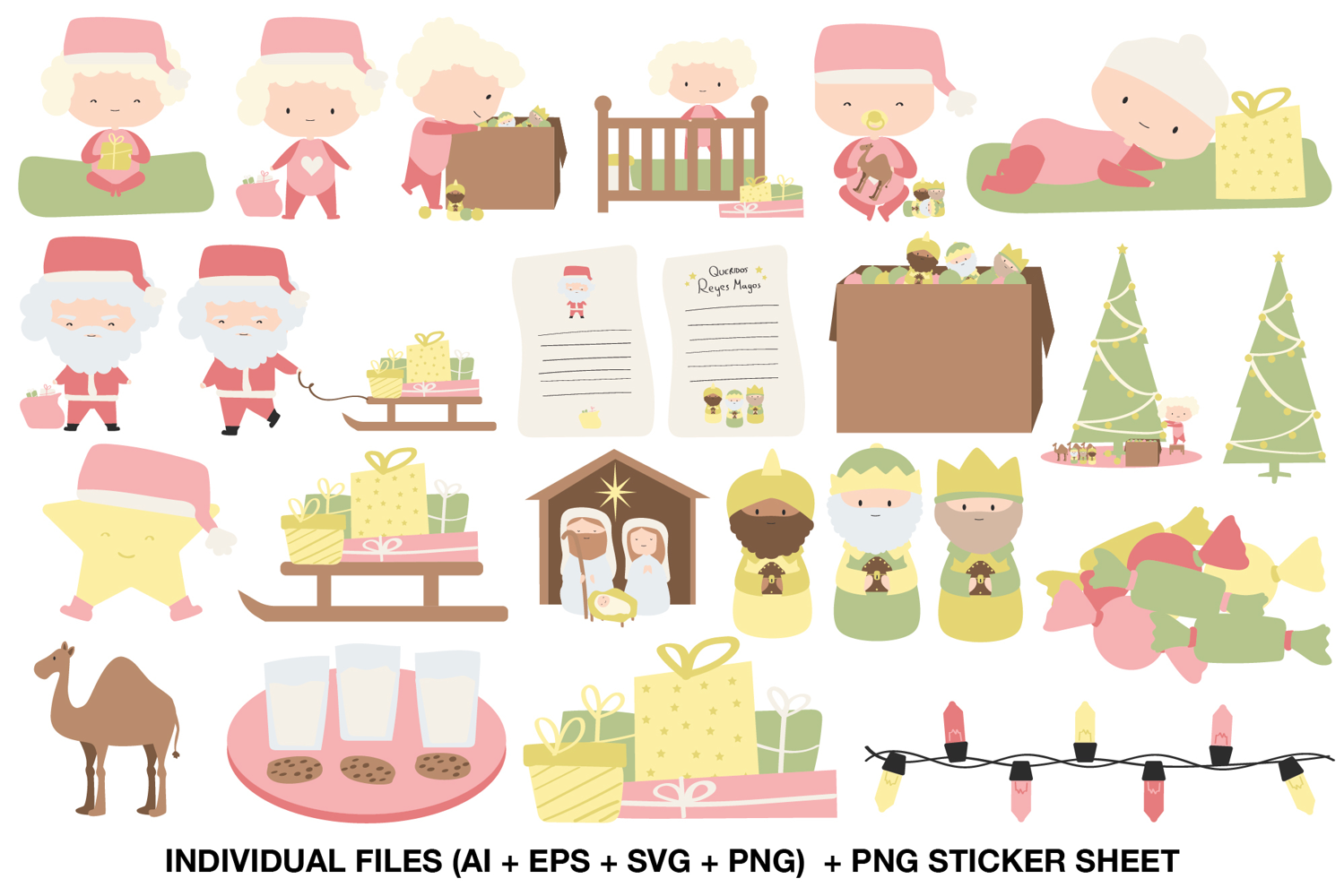 This festive bundle includes charming illustrations of Santa, babies, the Three Wise Men, nativity scenes, trees, gifts, cookies, and lights — all drawn in a soft pastel color palette that’s perfect for kids and family-themed crafts.