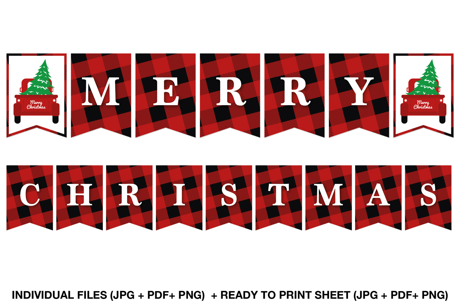 This Printable Merry Christmas Banner features a classic red and black buffalo plaid pattern with a vintage red truck carrying a Christmas tree. Perfect for farmhouse-style holiday décor, parties, or cozy winter gatherings.