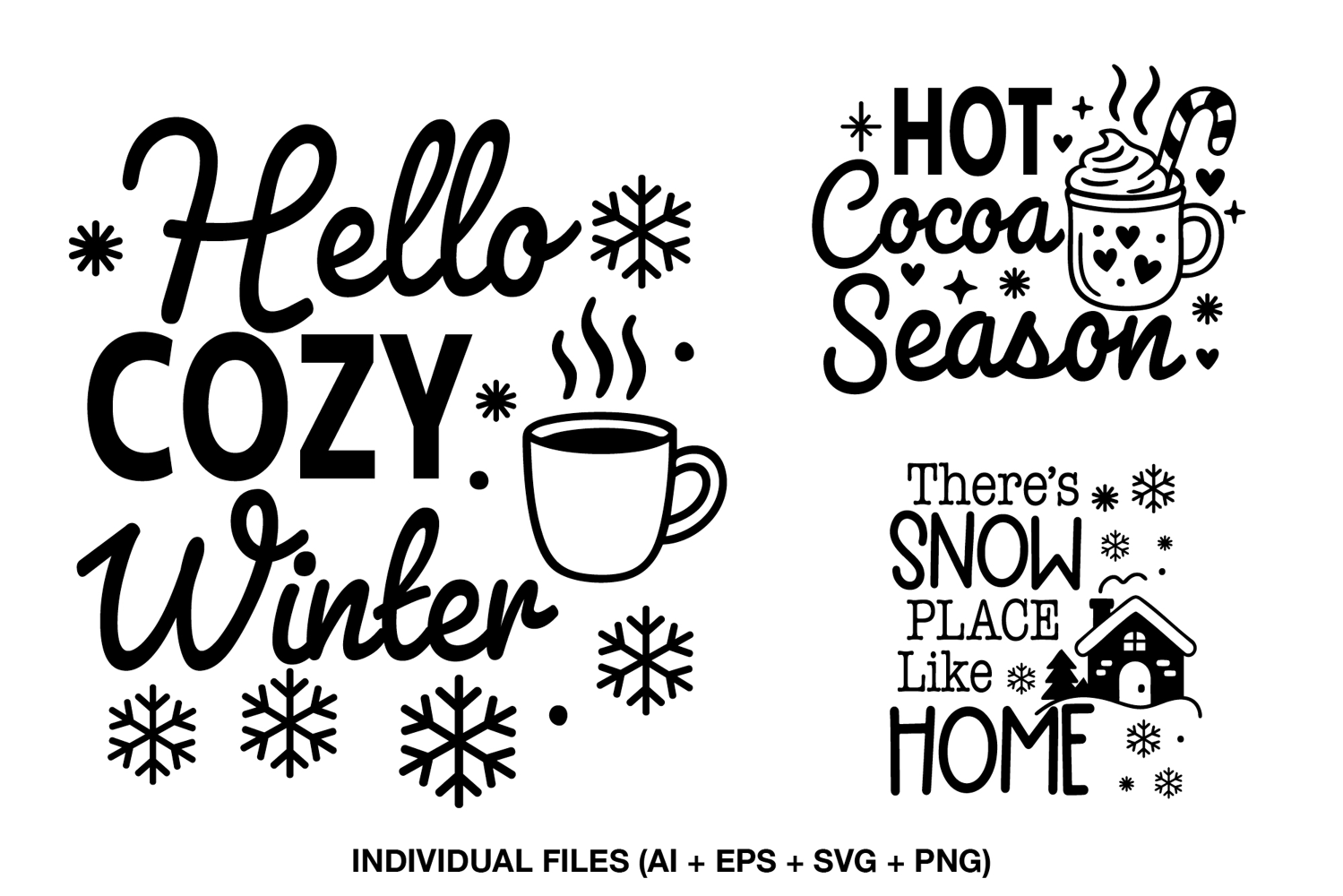 Cozy Winter SVG Bundle with hot cocoa and snow quotes – includes Hello Cozy Winter, Hot Cocoa Season, and There’s Snow Place Like Home designs, perfect for Cricut and Silhouette projects.