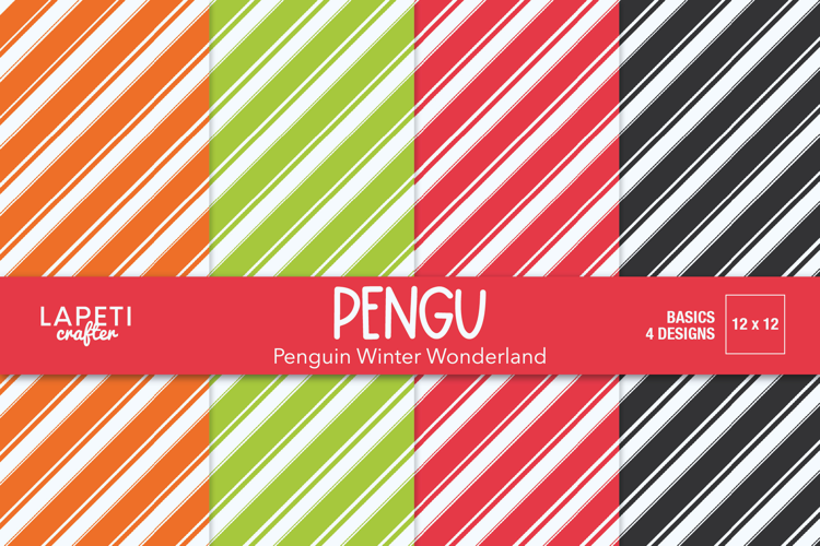 This set includes 4 bright diagonal stripe designs in red, lime green, orange, and black — inspired by the joyful colors of holiday penguin themes. The bold contrast and clean lines make these papers perfect as accent backgrounds or to coordinate with character illustrations, cliparts, and festive designs.