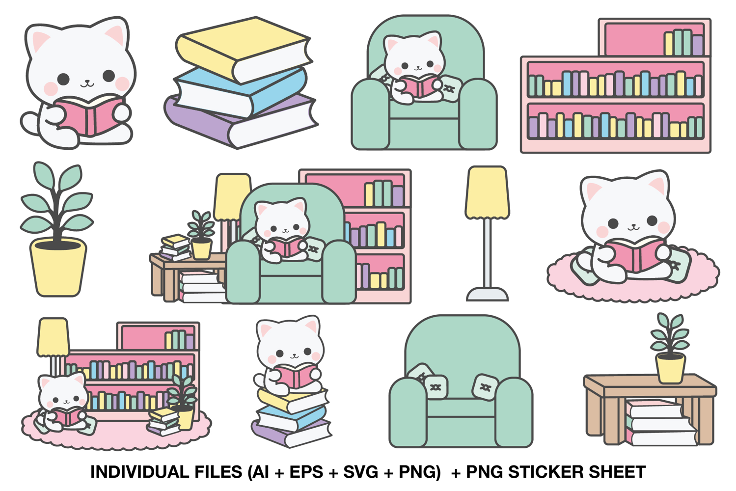 Bring calm, charm and sweetness to your creative projects with this Reading Time Cats Clipart Set. Designed in a soft pastel kawaii style, this bundle is perfect for planners, stickers, classroom materials, scrapbooking, reading logs and cozy themed designs. Each illustration features adorable cats enjoying books in warm reading corners, armchairs and book-filled spaces.