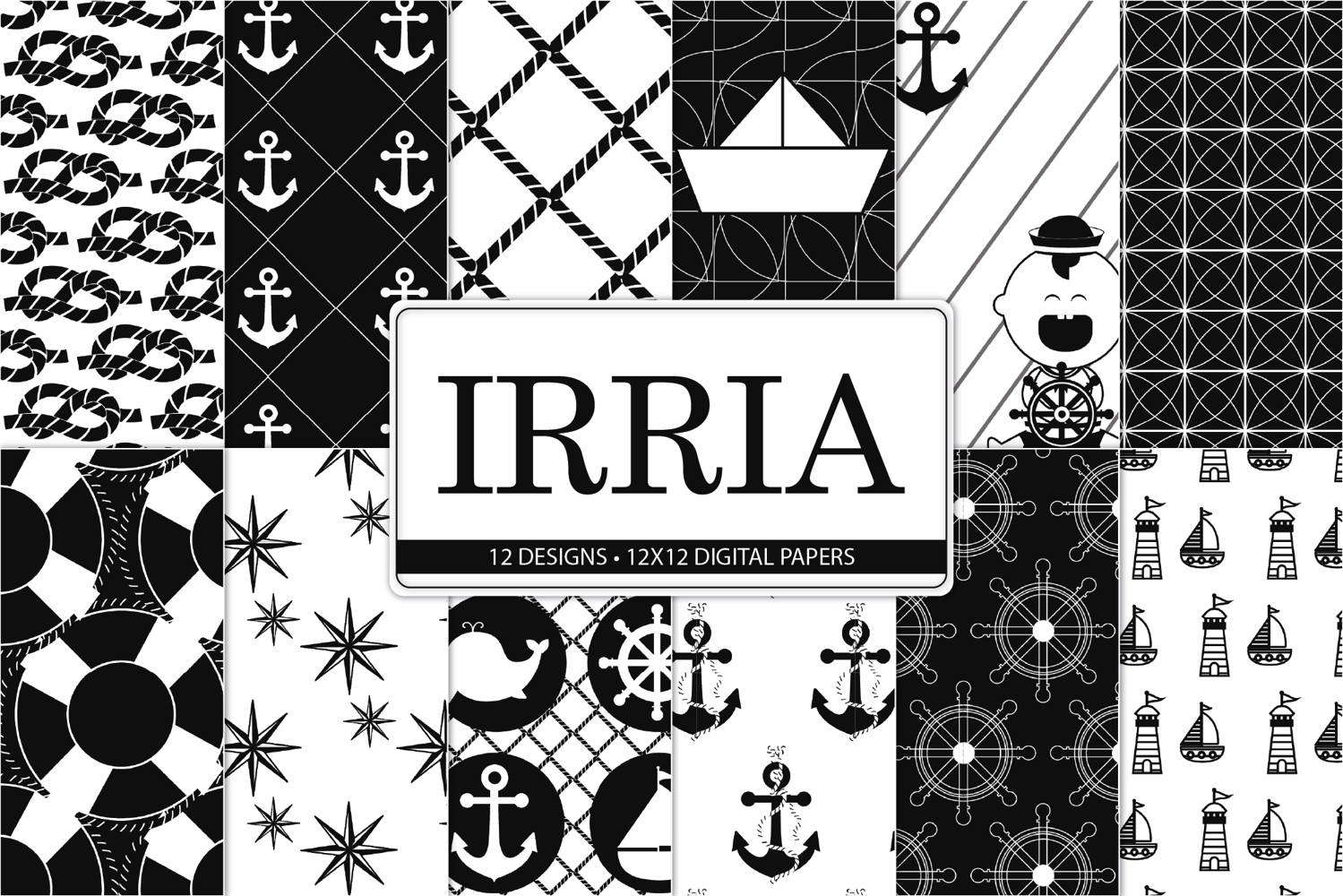 black white nautical digital paper pack