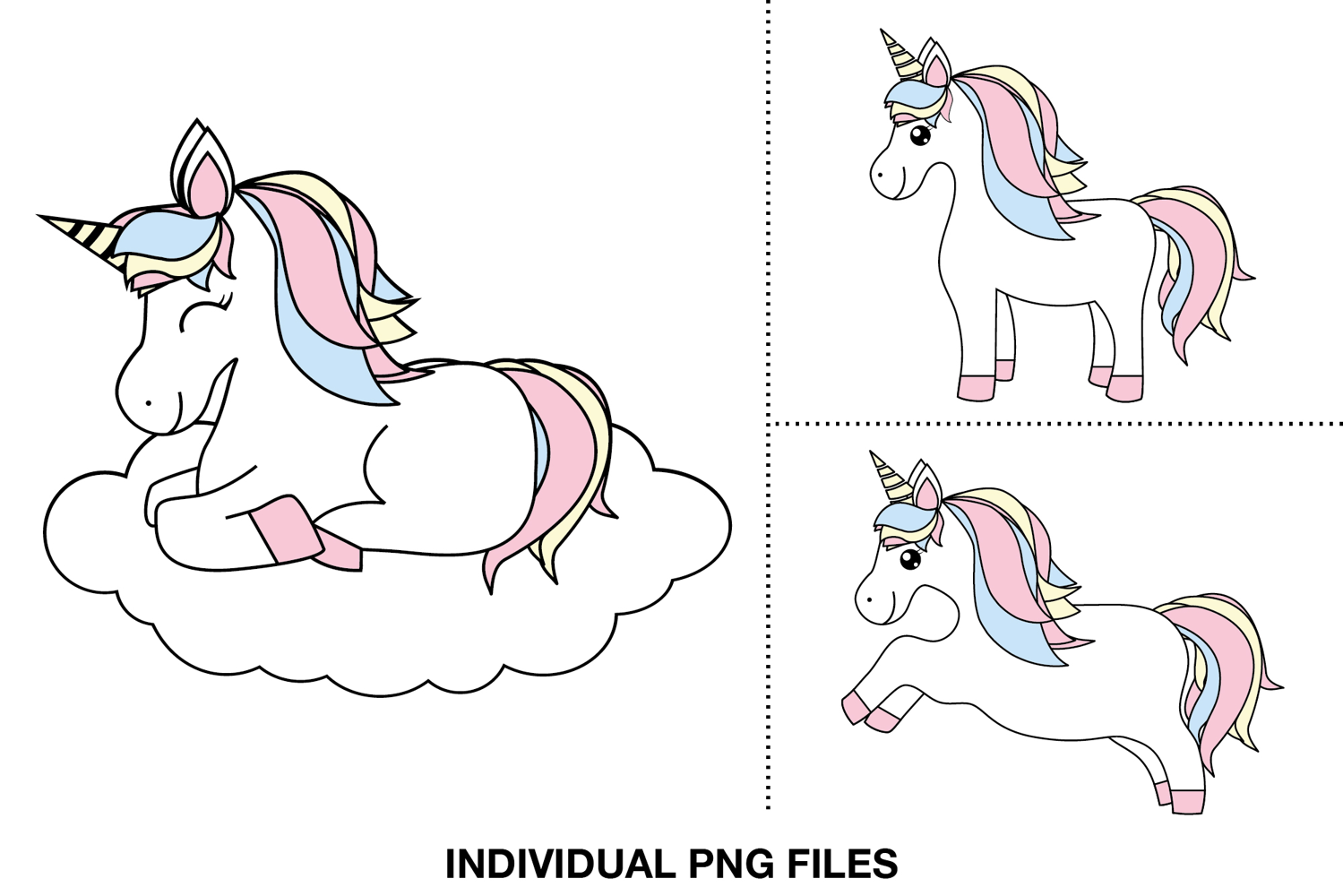 This adorable pack includes 3 unicorns in different poses — standing, flying, and resting on a cloud — each drawn in a kawaii pastel style with pink, blue, and yellow tones.