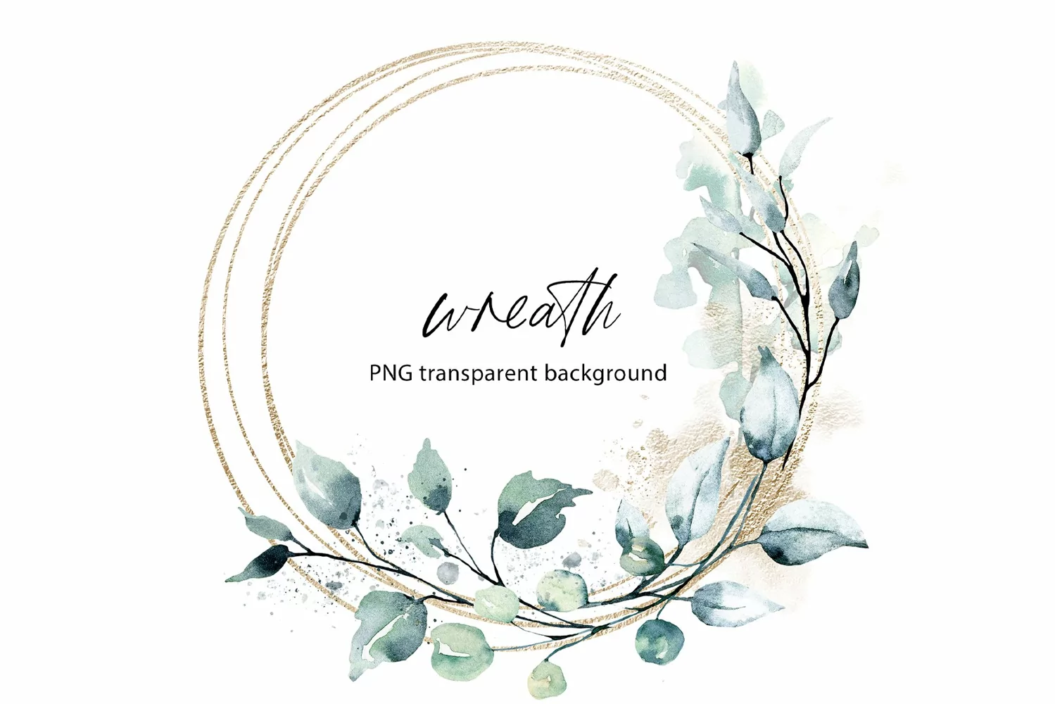 Watercolor leaves, floral clipart, gold wreath, frame with leaf, PNG transparent background, aquarelle clipart.