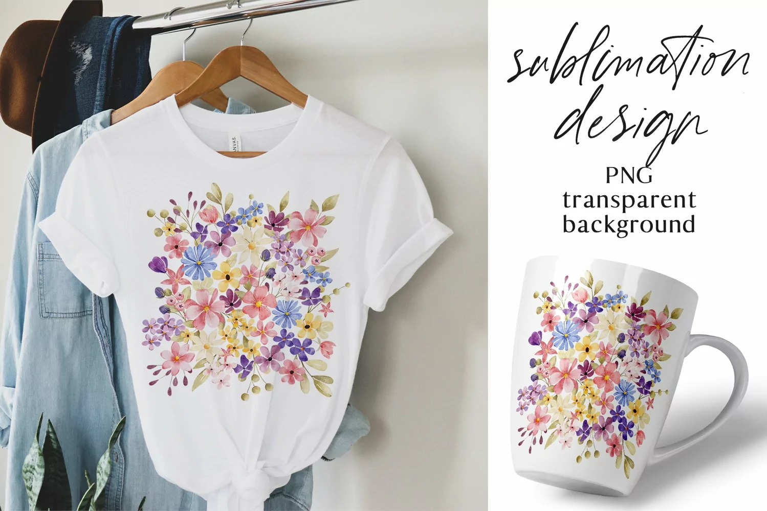Sublimation design, flowers and leaves, PNG file.