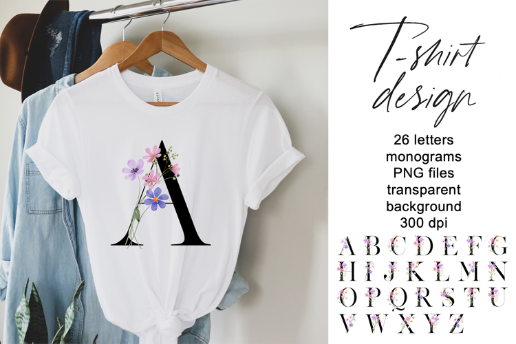 T-shirt design with monogram, flowers, leaf, PNG. example image 1
