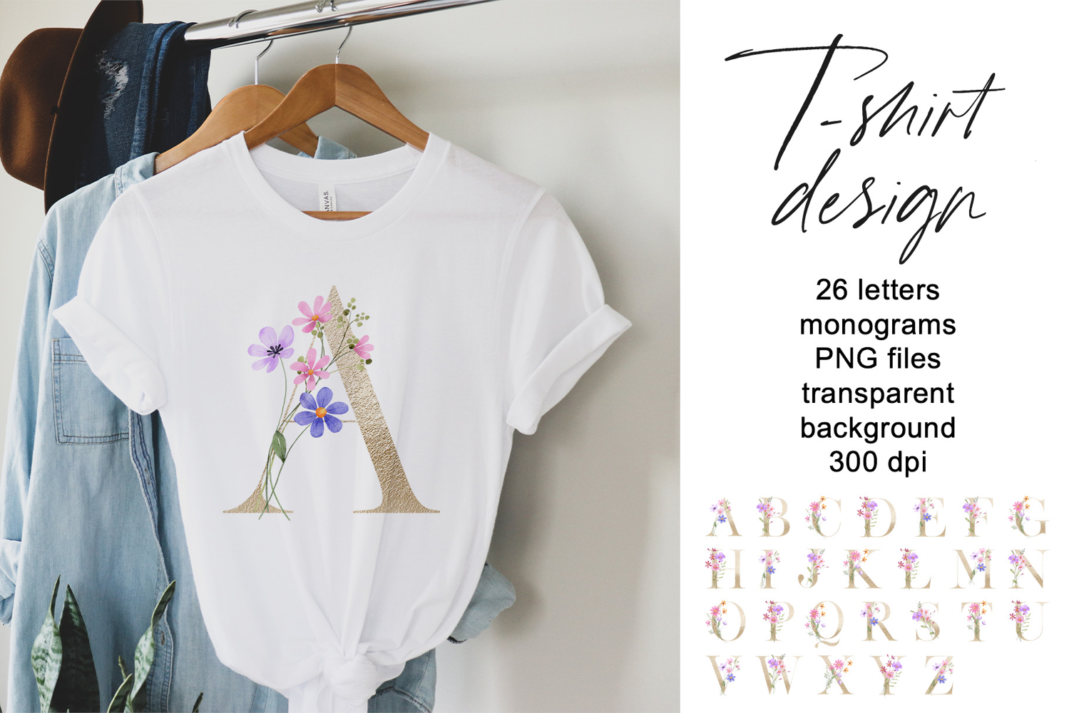 T-shirt design with gold monogram, flowers, leaf, PNG. example image 1