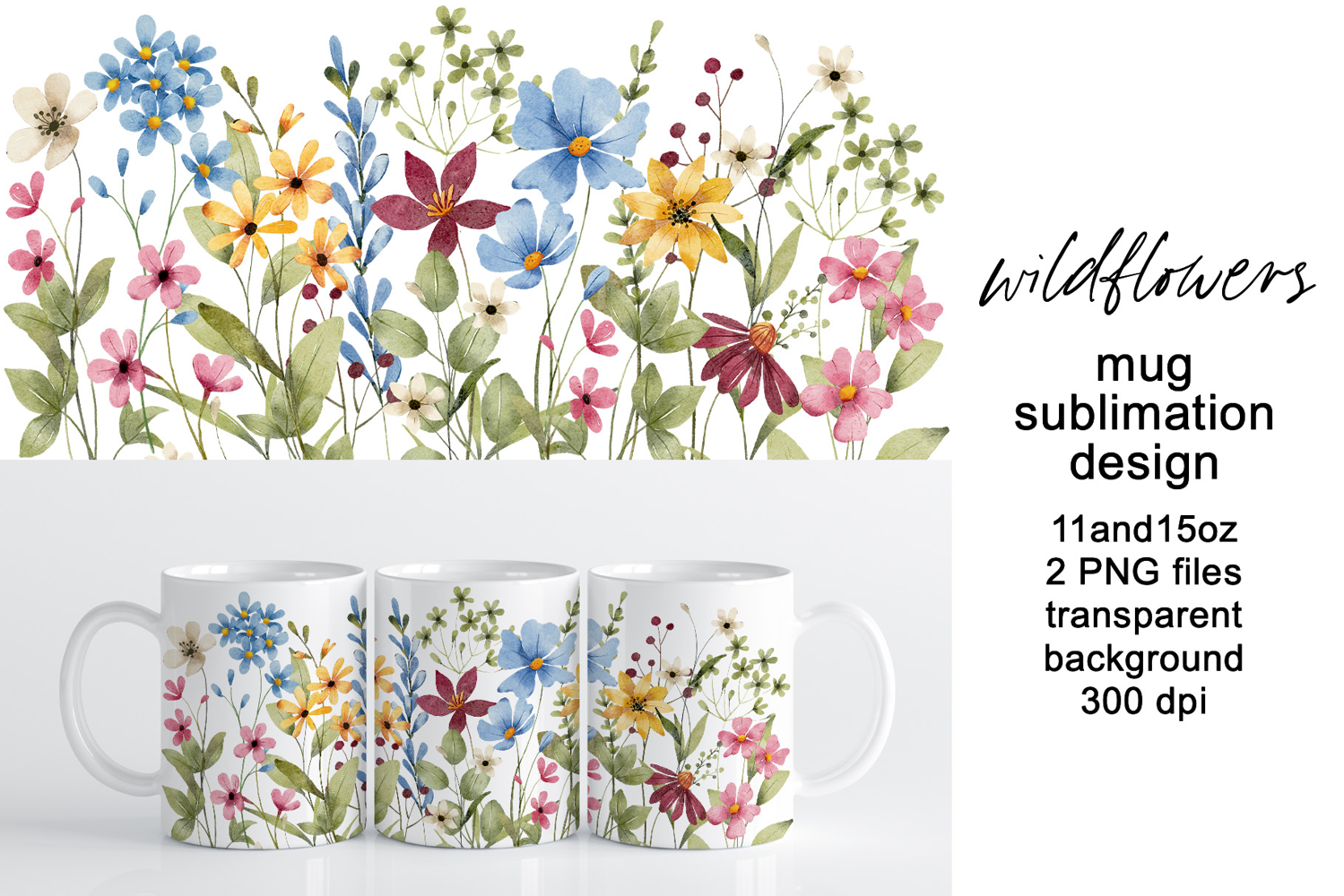 Mug wrap, sublimation design with wild flowers, digital PNG file, transparent background, watercolor clipart.