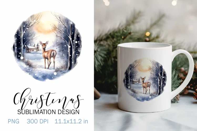 Christmas Sublimation Design PNG - Watercolor Deer in the forest clipart.