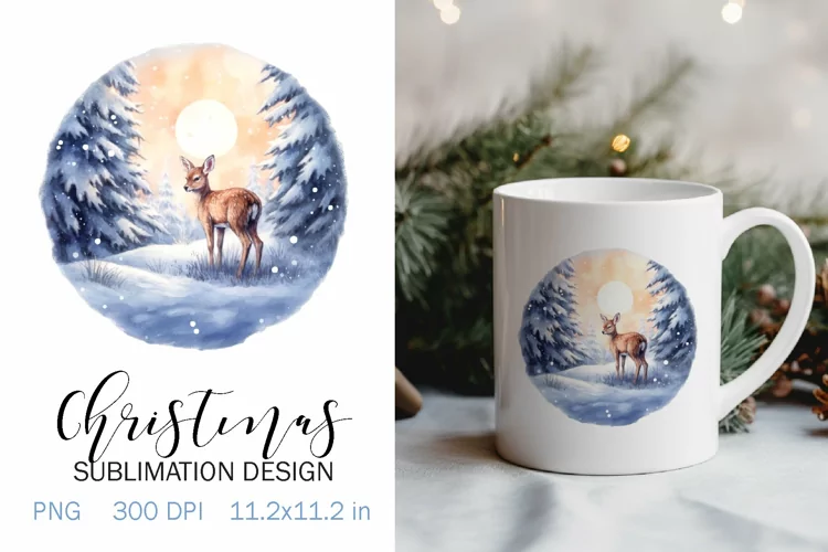 Christmas Sublimation Design PNG - Watercolor Deer in the forest clipart.