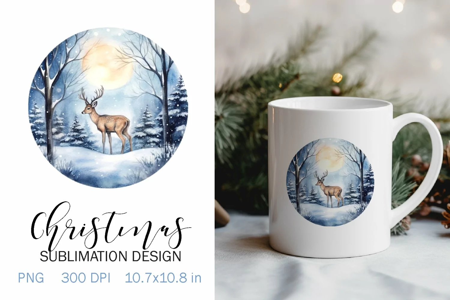 Christmas Sublimation Design PNG - Watercolor Deer in the forest clipart.