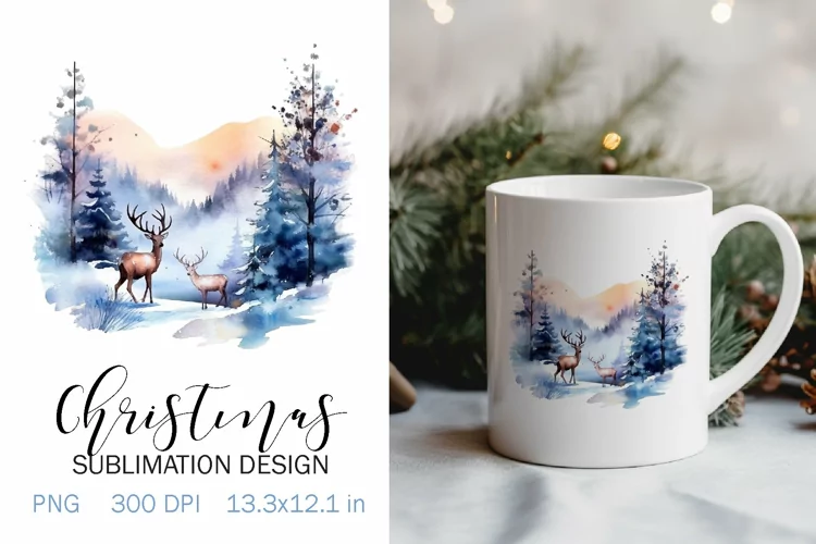 Christmas Sublimation Design PNG - Watercolor Deer in the forest clipart.