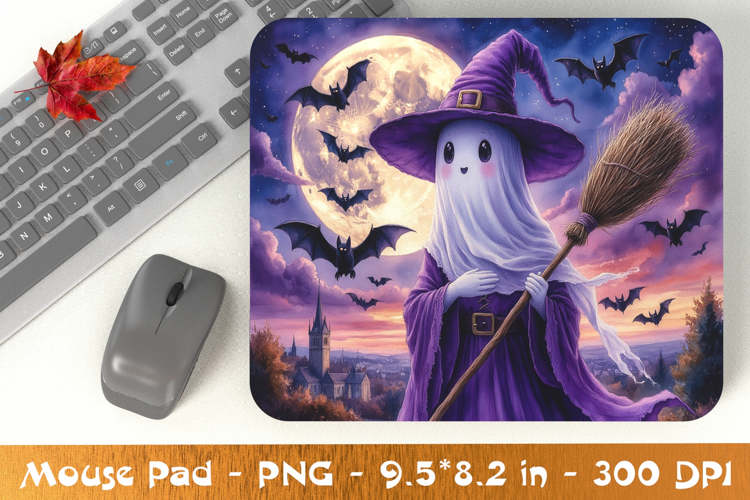 Transform your space with this magical ghost in a purple hat, flying bats, and a glowing full moon. Great for whimsical Halloween mouse pads.