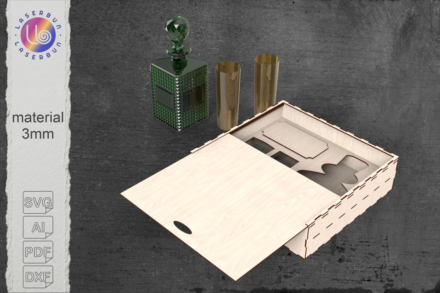 Gift Box Template Laser Cut Svg Sliding Lid Box Whiskey Box Svg Wooden Box File Cnc Packaging Svg Ai Pdf Dxf Alcohol Gift Case Decanter Packaging 3mm Wood Box