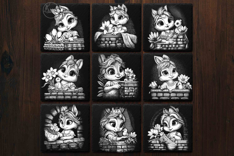 Brighten up your home with this adorable collection of 9 spring-themed engraving designs! This bundle features charming baby bunnies with flowers and chicks, perfect for creating high-quality slate coasters or spring decor. Each design has been meticulously detailed to ensure a perfect look on stone and dark materials.