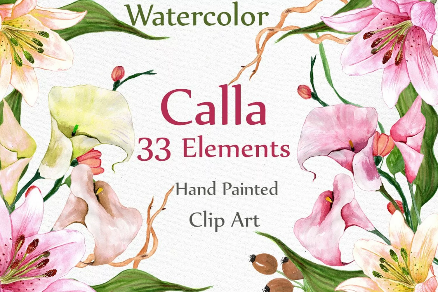 This is a great set of high quality hand painted watercolor flowers and elements. Perfect illustrations for all designs, wedding invitations, websites, blogs. cards, DIY designs...This set includes: