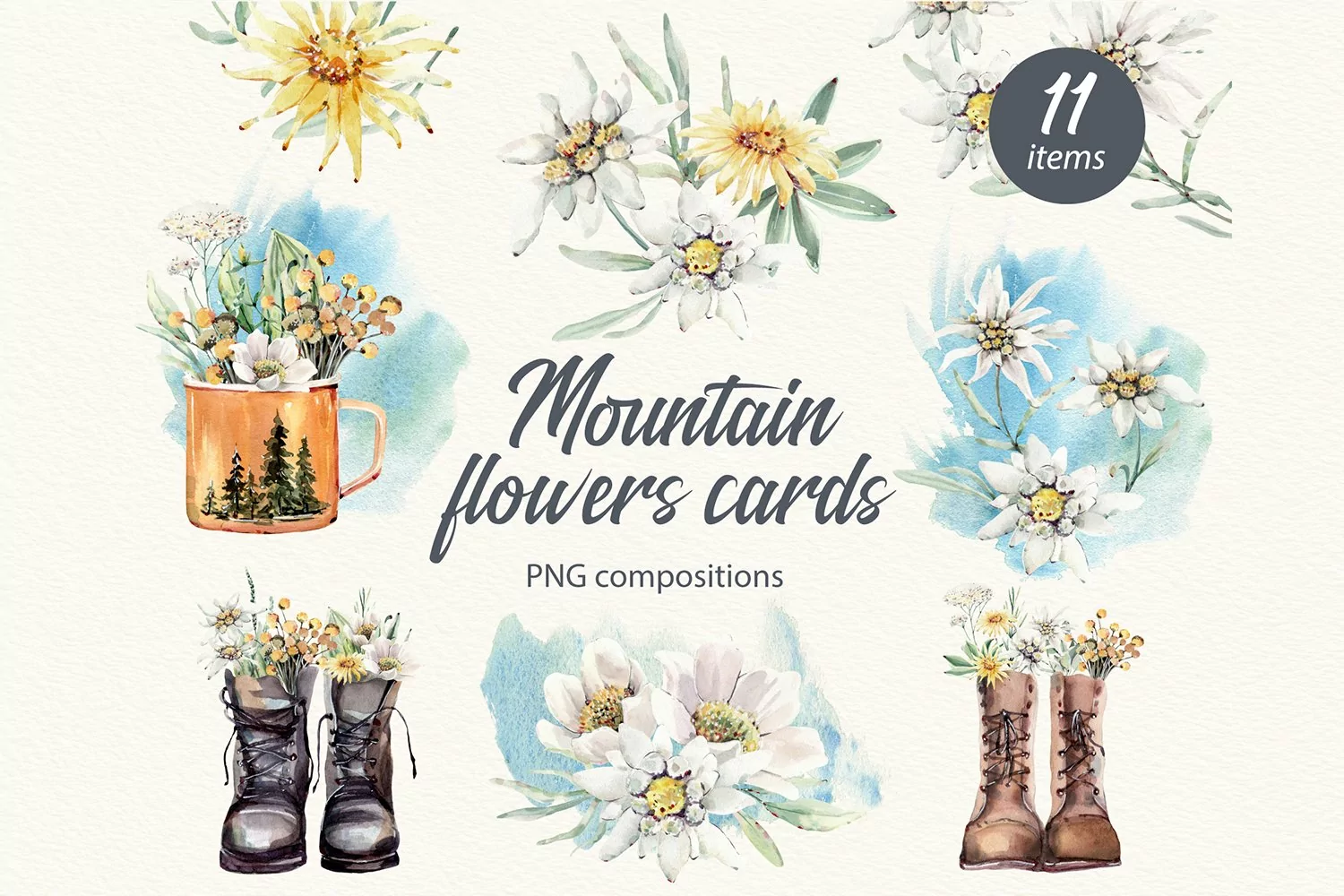Summer Clipart Summer Cards Wildflowers Wreath Wildflowers Frame Mountain Watercolor Clipart Mountain Wedding Mountain Lifestyle Edelweiss Watercolor Summer Flowers Card Mountain Wildflowers