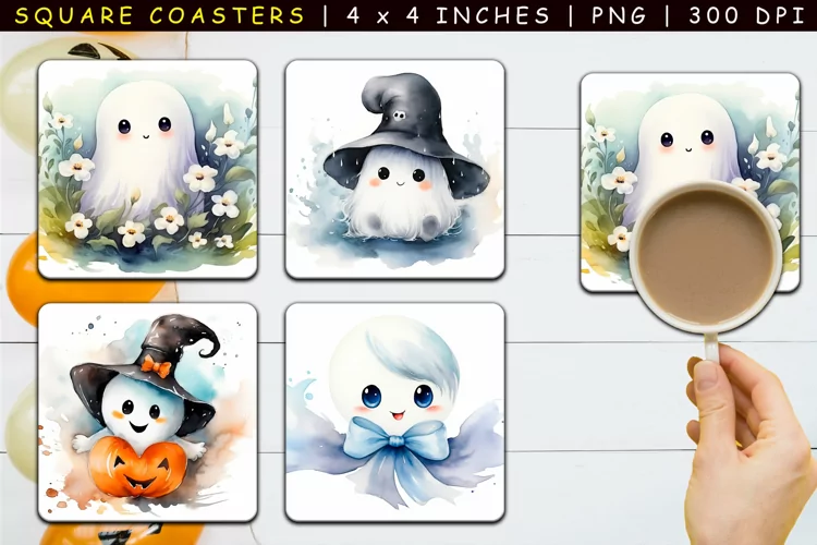 4 Cute Ghost Square Coasters Sublimation example image 1