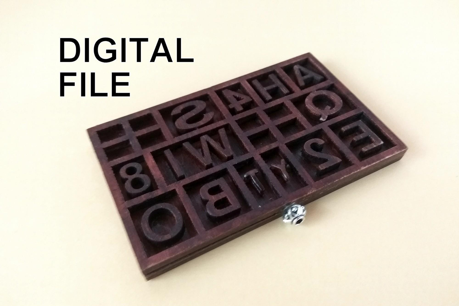 Miniature typography drawer digital vector file board with letters. Dollhouse letterpress box download DIY accessories diorama. Wood printed