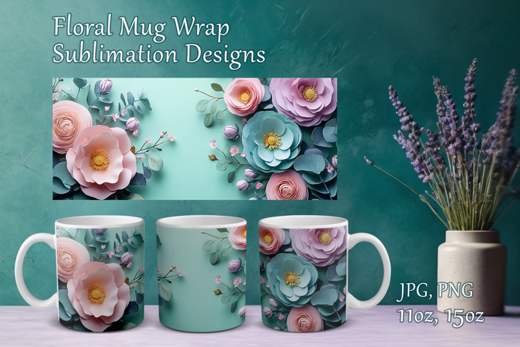 Paper Flowers Design Mug Sublimation. Floral Cup Mug Wrap