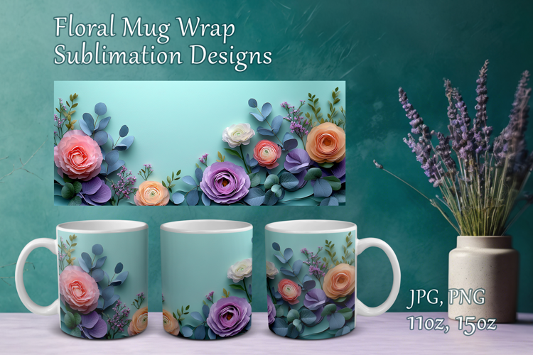 Paper Flowers Mug Sublimation. Floral Design Cup Mug Wrap