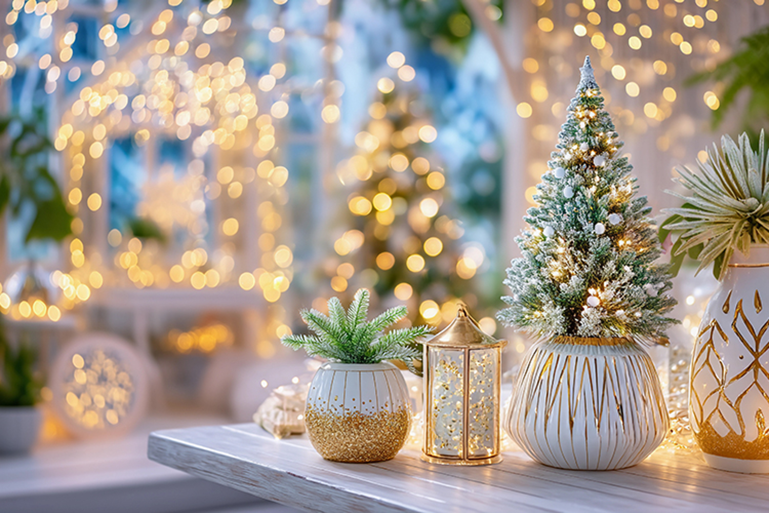 Bright bokeh background creates warm holiday atmosphere, perfect for seasonal celebration and design.