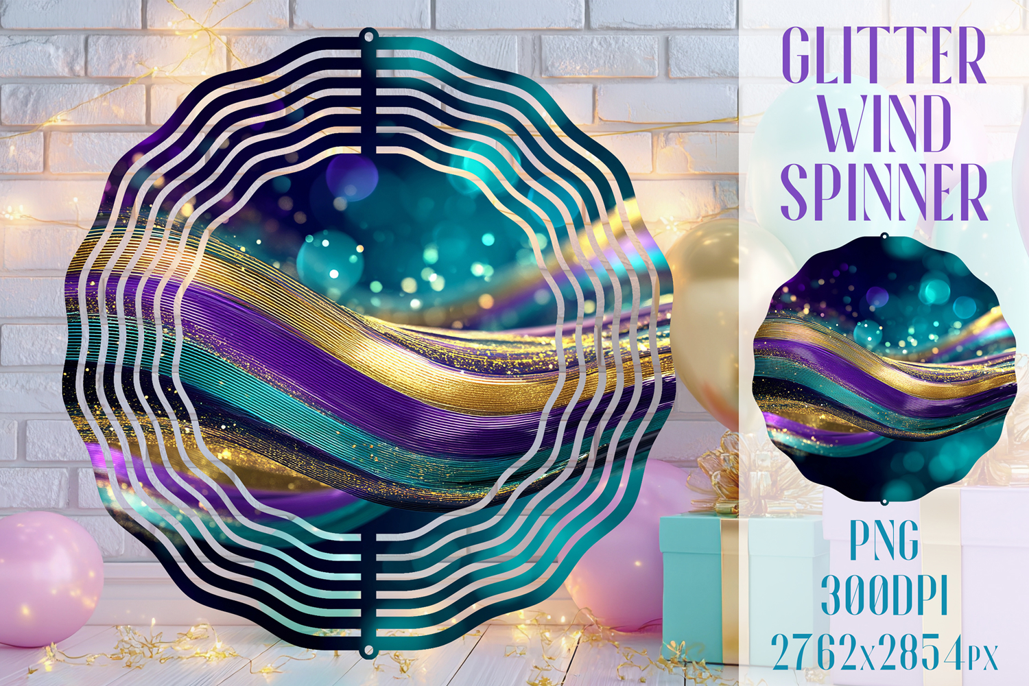Glitter Wind Spinner Sublimation. Teal Violet Golden Waves