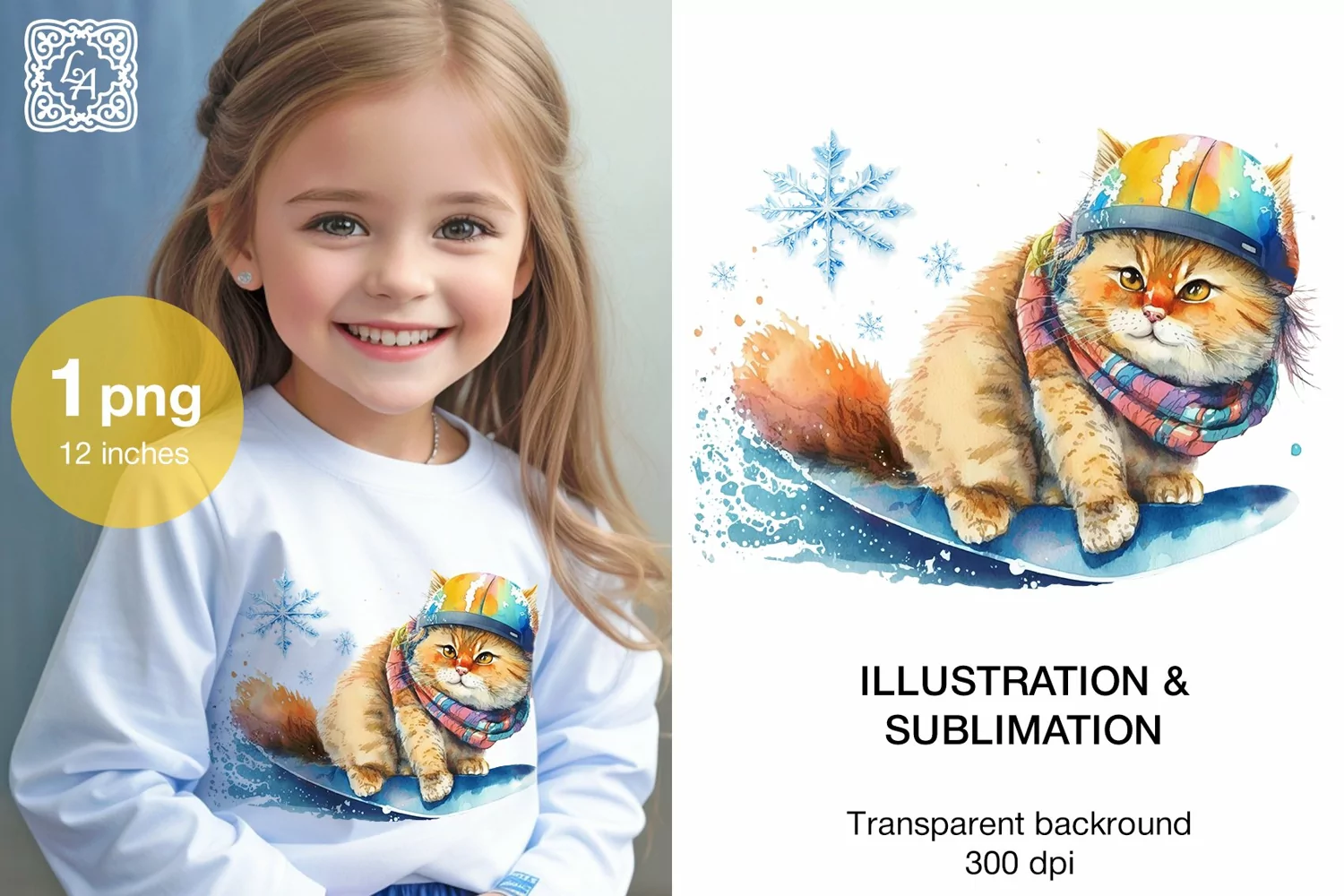 Cute Watercolor Illustration Christmas Illustration Winter Sport Baby Print Watercolor Sublimation Winter Sublimation T-shirt Sublimation Snowboarder Sublimation Cat Snowboarder
