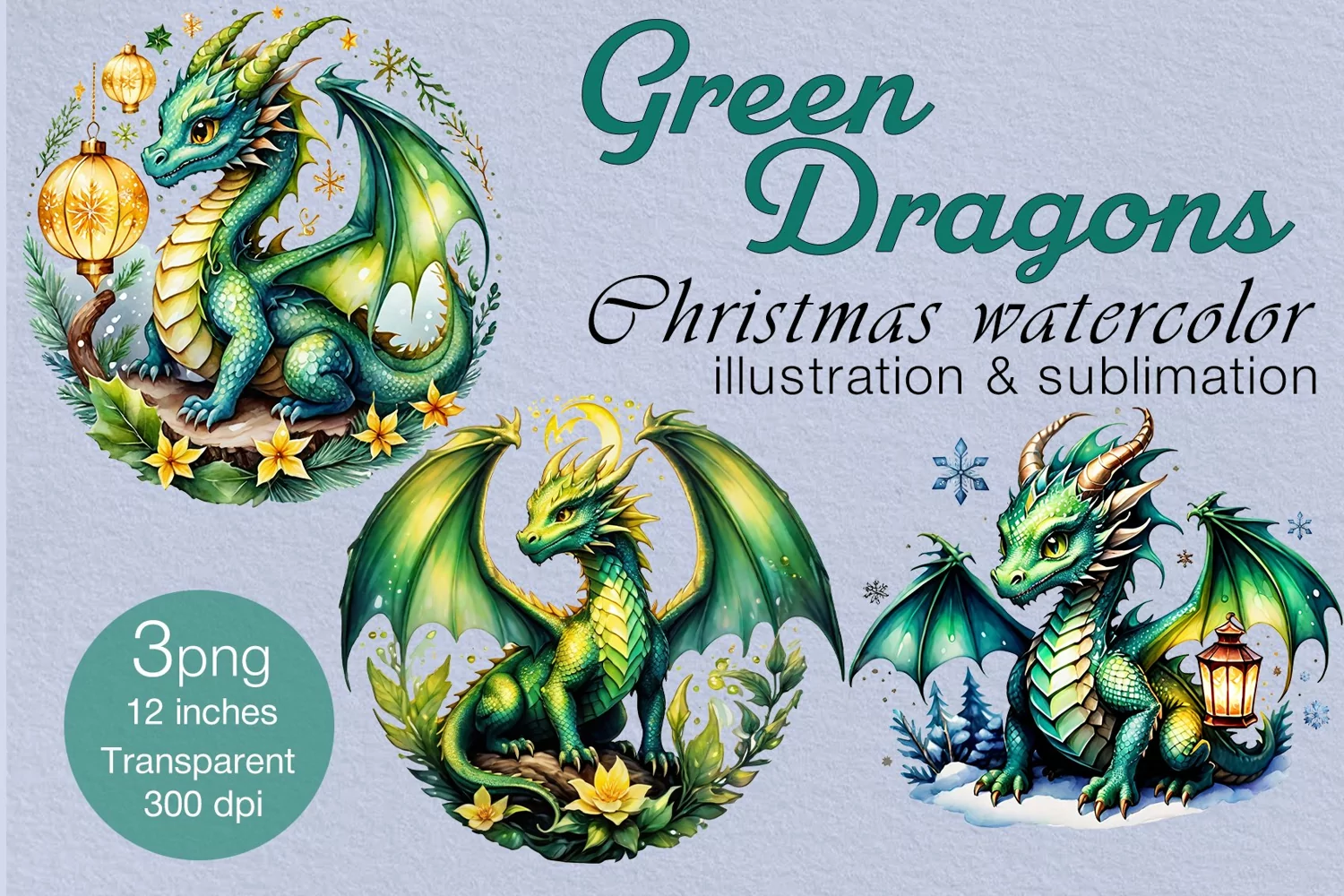 3 Dragon 3PNG watercolor Christmas clipart