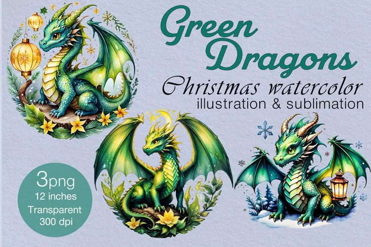 3 Dragon 3PNG watercolor Christmas clipart example image 1