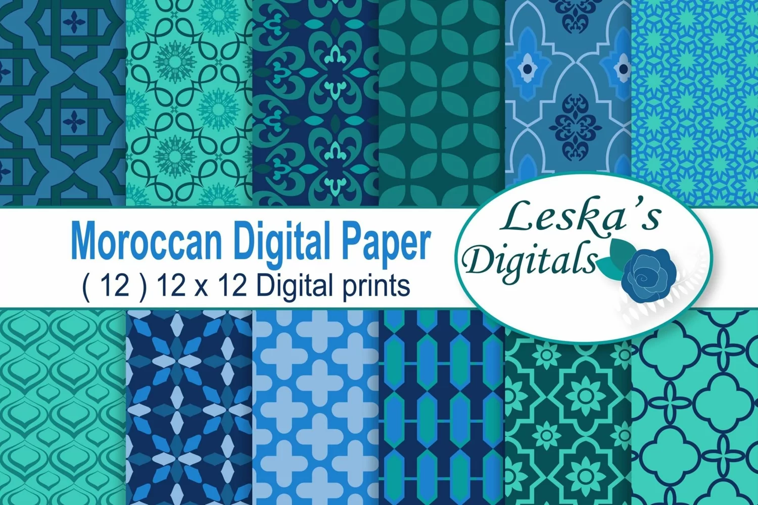 (12) blue-green Moroccan digital paper pattern designs in 12 x 12 sheets for invites, scrapbooking, craft projects, stationary, website and blog wallpaper, card making, wrapping paper, hang tags, decorations, birthday cards, mothers day cards and all your fun pattern projects!