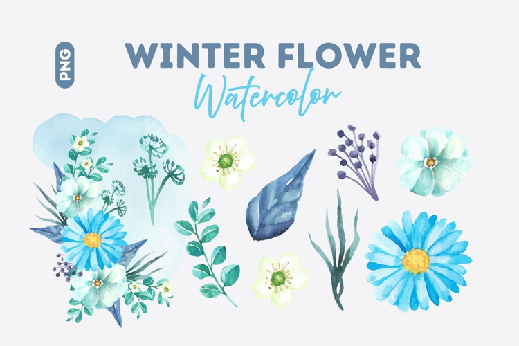 Each element is hand-painted with soft watercolor textures, featuring frosty blue blossoms, delicate leaves, and charming botanical accents. Perfect for wedding invitations, greeting cards, branding, digital scrapbooking, stationery, and seasonal crafts, this floral set adds a calm and elegant winter touch to any design.