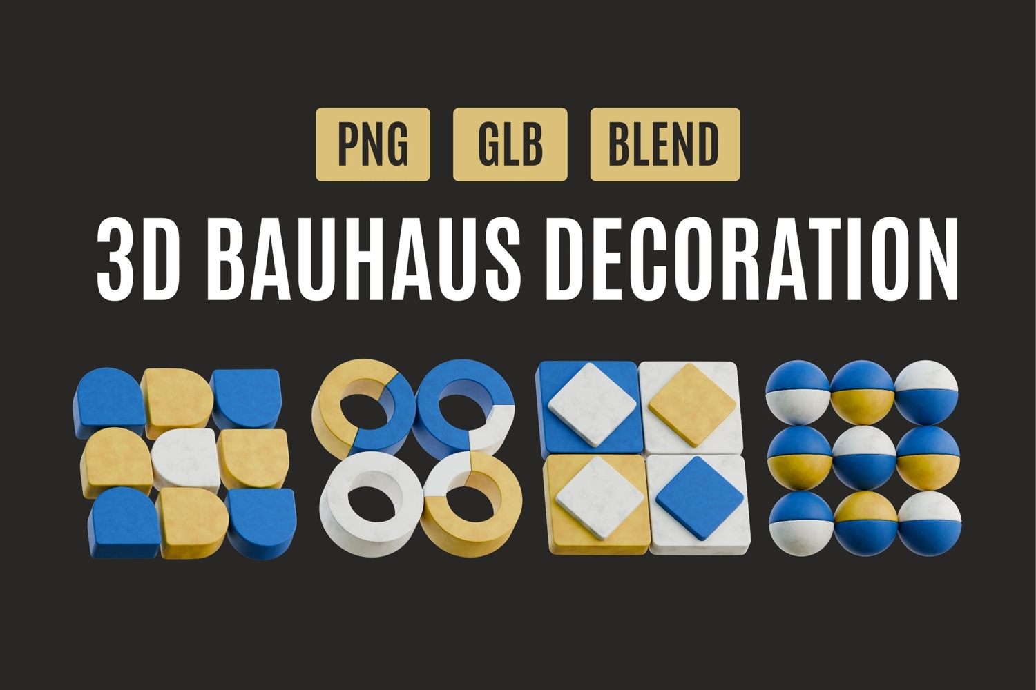 Inspired by the iconic Bauhaus movement, this pack features bold geometric shapes, smooth 3D forms, and a striking color palette of blue, gold, white, and black. Each piece is crafted to bring sophistication and playful energy to your creative projects — perfect for designers who love structure with a twist! 💛💙