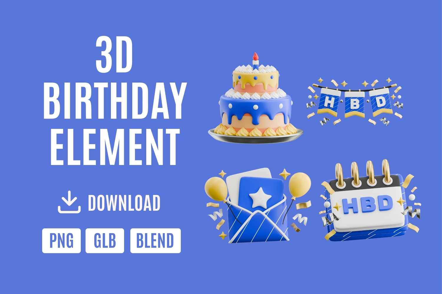 Each item is beautifully crafted in a playful blue and gold color palette, giving your designs a polished yet festive vibe. Whether you’re creating birthday invitations, greeting cards, posters, web banners, or social media posts, these 3D assets will make every project shine with energy and fun!