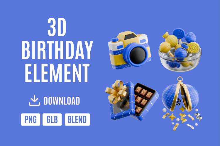 Each item is beautifully crafted in a playful blue and gold color palette, giving your designs a polished yet festive vibe. Whether you’re creating birthday invitations, greeting cards, posters, web banners, or social media posts, these 3D assets will make every project shine with energy and fun!