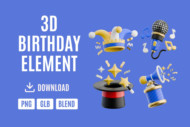 Each item is beautifully crafted in a playful blue and gold color palette, giving your designs a polished yet festive vibe. Whether you’re creating birthday invitations, greeting cards, posters, web banners, or social media posts, these 3D assets will make every project shine with energy and fun!