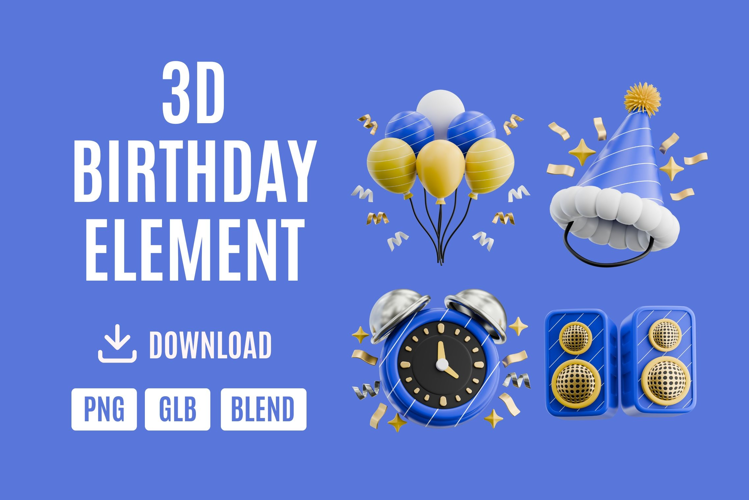 Each item is beautifully crafted in a playful blue and gold color palette, giving your designs a polished yet festive vibe. Whether you’re creating birthday invitations, greeting cards, posters, web banners, or social media posts, these 3D assets will make every project shine with energy and fun!