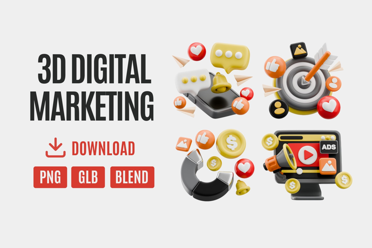 Whether you're designing for ads, websites, social media campaigns, presentations, or app interfaces, these 3D assets help communicate your marketing message with clarity and style. Every model comes in PNG, GLB, and BLEND formats, offering flexibility for both 2D and 3D workflows.