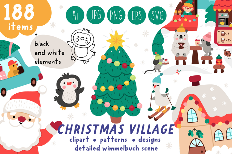 Meet my Christmas village clipart and designs collection. This pack includes lots of clipart elements with cute Santa Claus and his elves, winter detailed wimmelbuch like landscapes, funny animals and of course cozy snowy village scenes. The elements are perfect for a Christmas or New Year party designs. You can create your own self-publishing book or coloring pages: it’s extremely easy to combine the elements, making your own unique product. There are also pre-made designs, frames and seamless patterns. You will get all the elements in color and black and white. This collection is suitable for Christmas party crafts, picture and coloring books, decorations, mobile apps and games, jigsaw puzzles, prints, banners, invitations, stationery, clothes, stickers, patches, fabrics and so much more. All the items are originally vector, so you can modify them, change size and recolor.