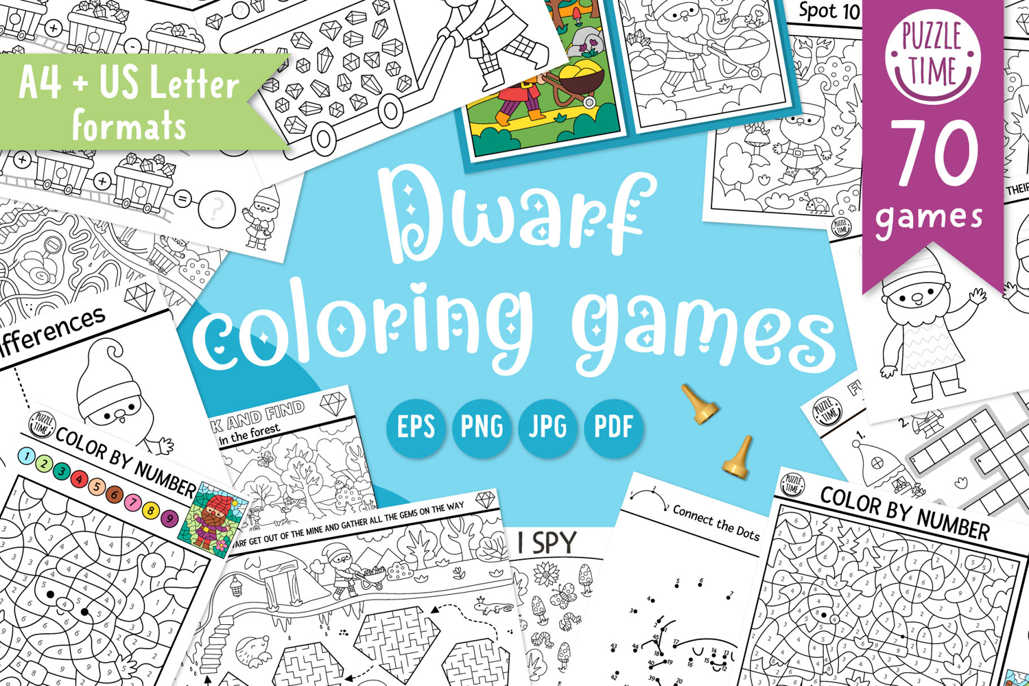 Meet my Dwarf coloring games and activities for kids. This pack includes cute dwarfs and other fairytale characters, woodland animals, magic forest scenes. Cute fantasy gnome houses, enchanted garden, smithy and even underground mining tunnel: in this pack, you’ll find everything to submerge in the wonderful magic atmosphere. These games are perfect for a kids’ party or just as a fun activity kit to get kids busy. You can create your own magic self-publishing books: it’s extremely easy to combine the games, making your own unique product. These activities can also be used to create family bonding moments or as an original and memorable gift. Have fun!