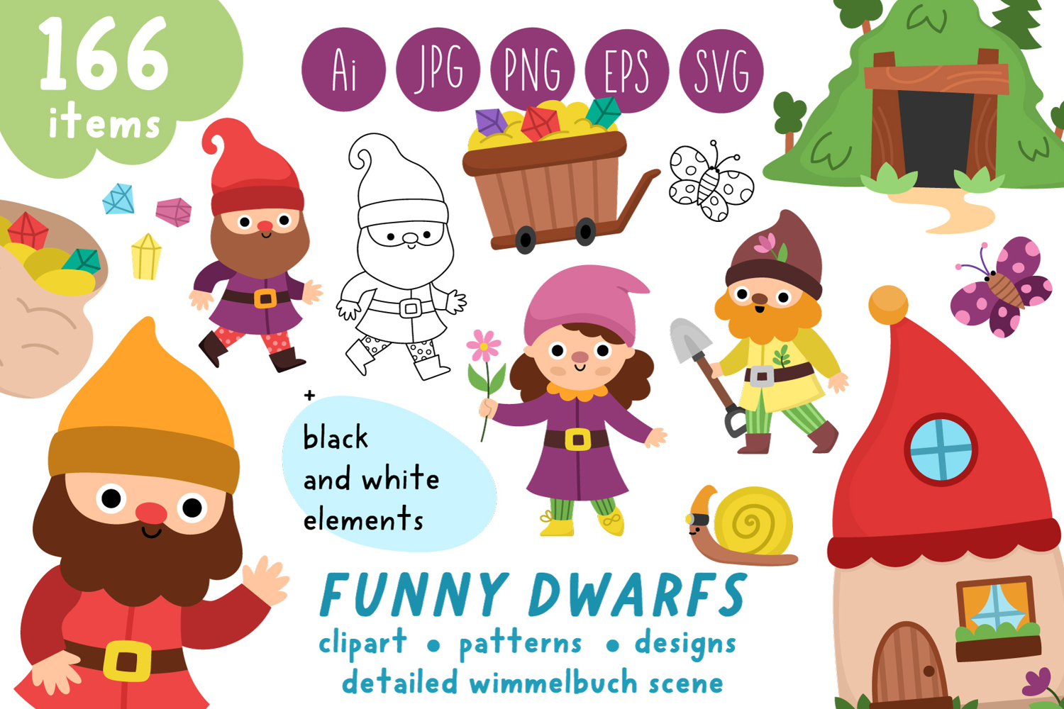 Meet my Funny dwarfs clipart and designs collection. This pack includes lots of clipart elements with cute dwarfs and other fairytale characters, woodland animals, magic forest detailed wimmelbuch like landscapes and cozy gnome village scenes. The elements are perfect for kid’s party designs. You can create your own self-publishing book or coloring pages: it’s extremely easy to combine the elements, making your own unique product. There are also pre-made designs, frames and seamless patterns. You will get all the elements in color and black and white. This collection is suitable for children crafts, picture and coloring books, decorations, mobile apps and games, jigsaw puzzles, prints, banners, invitations, stationery, clothes, stickers, patches, fabrics and so much more. All the items are originally vector, so you can modify them, change size and recolor.