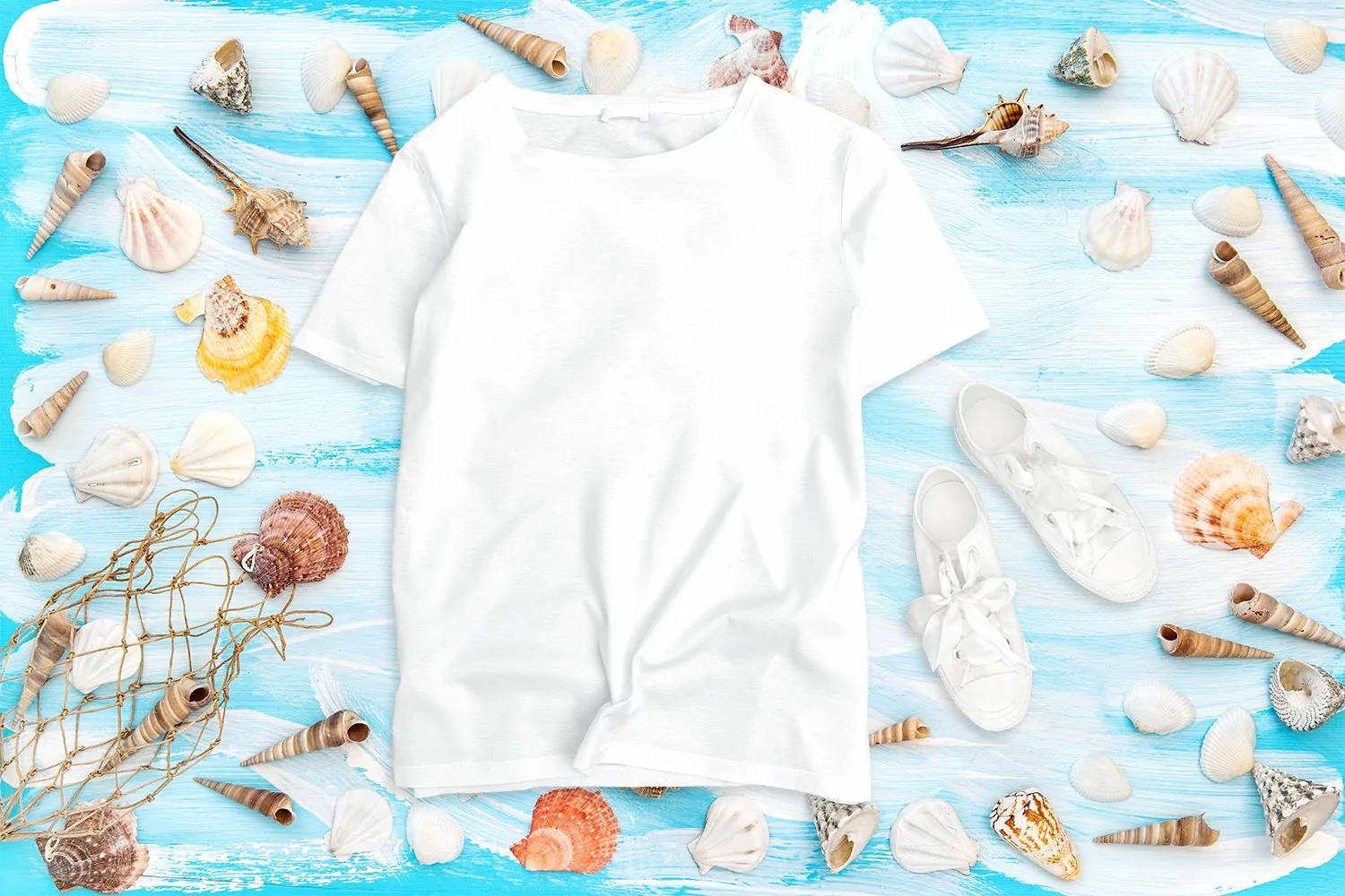 T-shirt mockup flat lay. Sea shells on blue wooden background