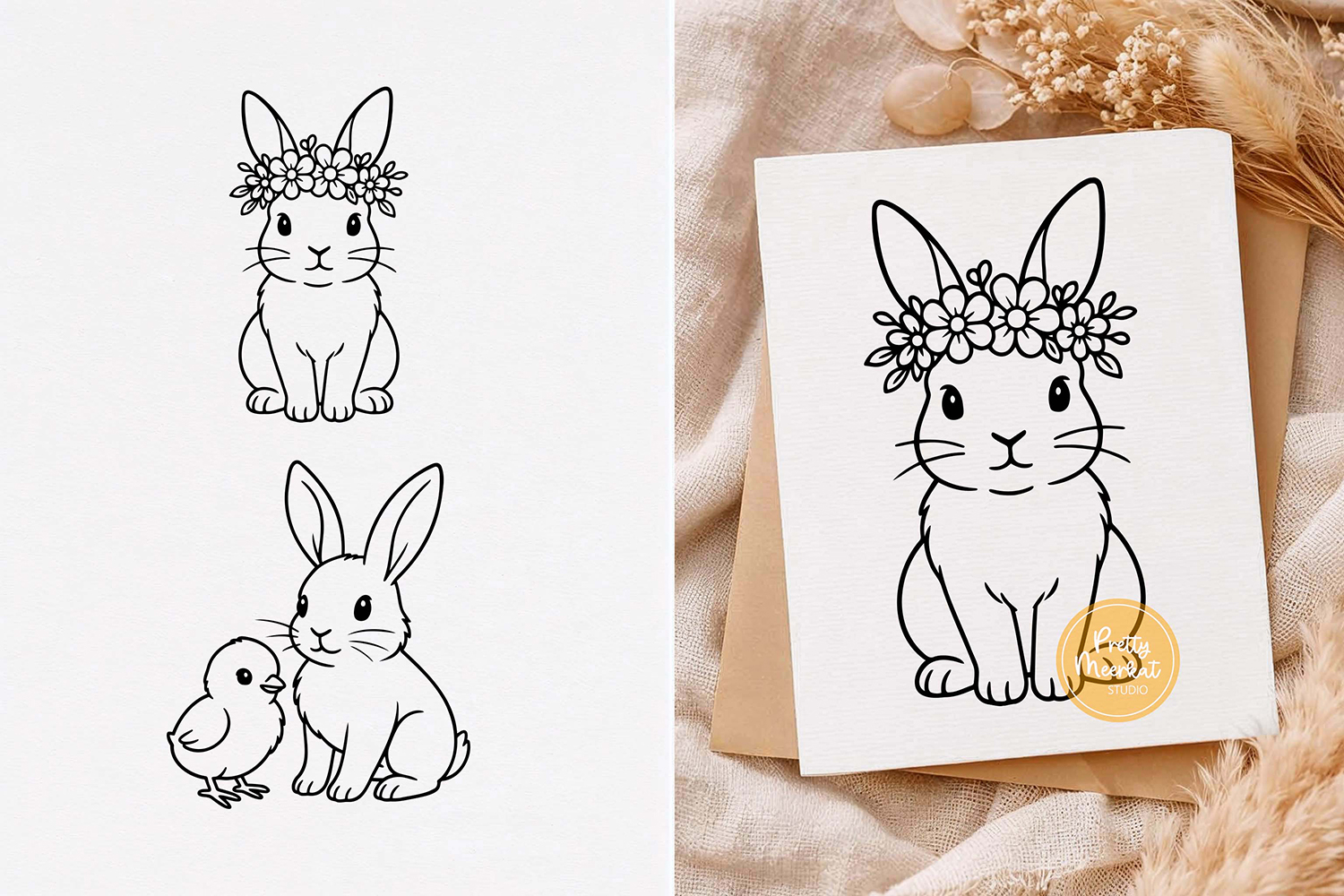 Outline Line Art Easter Svg Easter Cut Files Easter Bunny Svg Spring Svg Line Drawing Easter Clipart Bunny With Chick Svg Bunny With Floral Crown Svg
