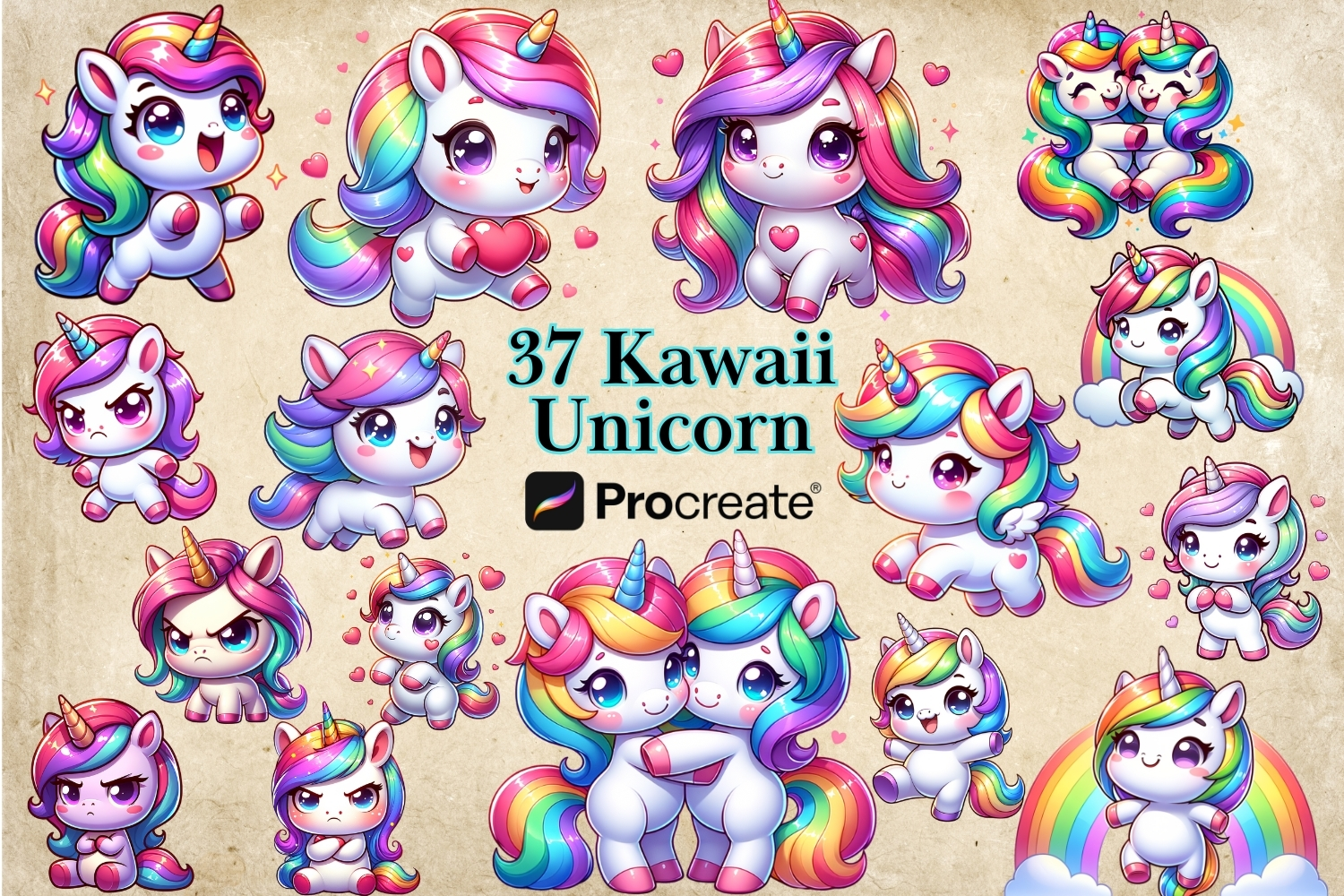 - 1 .brushset file with 37 Kawaii Unicorn Stamps.