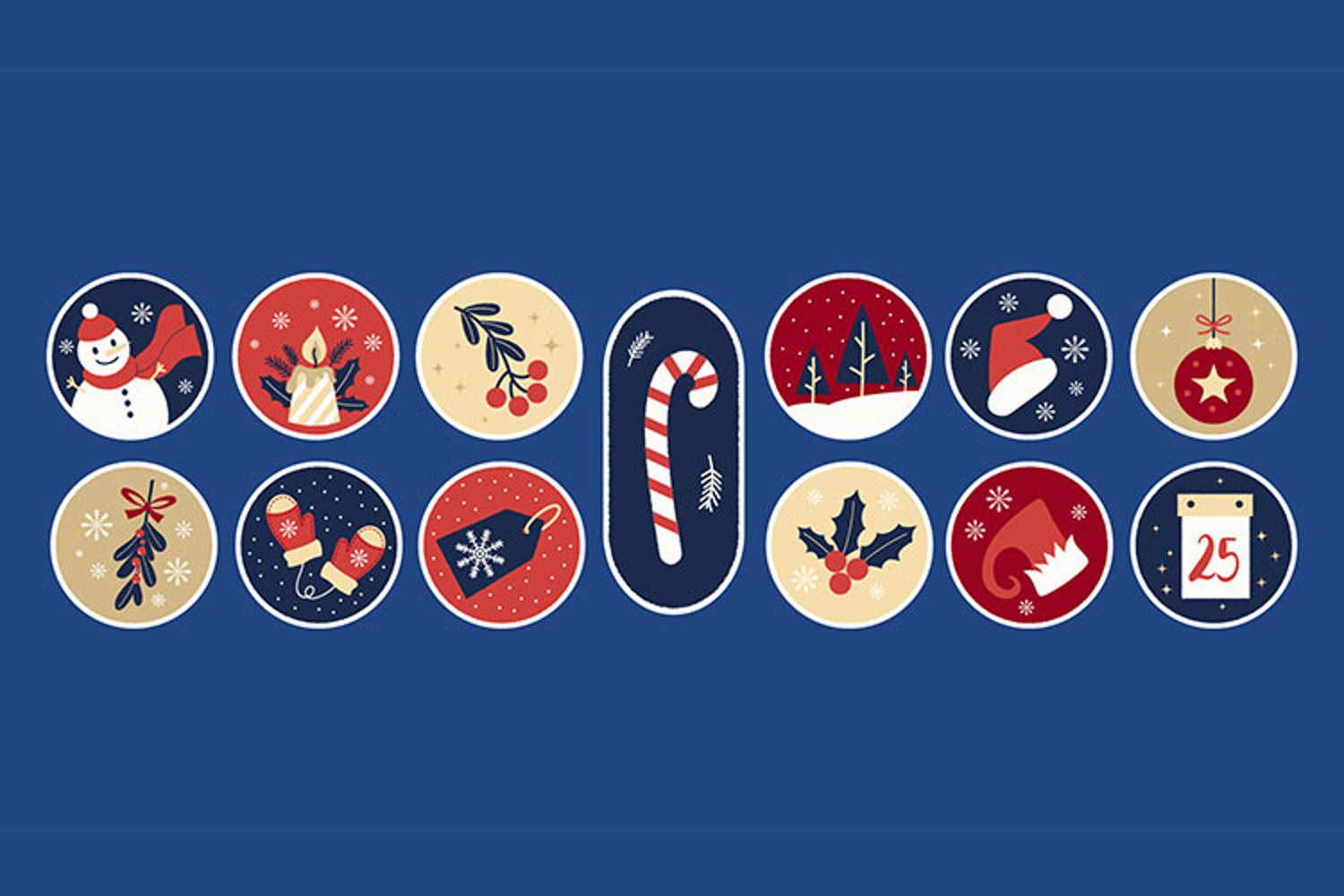 Merry Round Sticker Planner Set. Christmas labels Icons with Holiday Element cute snowman, New Year ball, Xmas Tree, price tag, candy cane Santa hat and holly